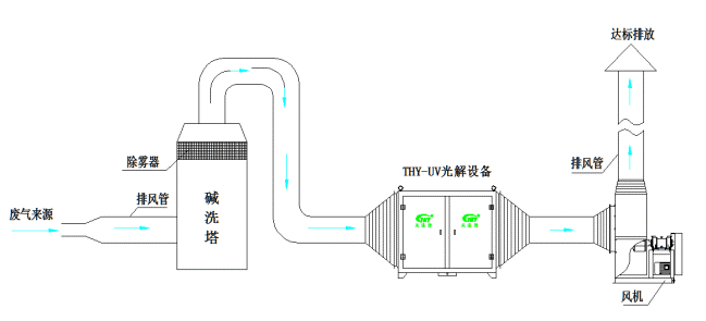 集氣罩收集垃圾臭氣→ 風(fēng)機引風→ 噴淋塔→ UV光解淨化設備→ 風機→ 煙(yān)囪達標排放(fàng)。