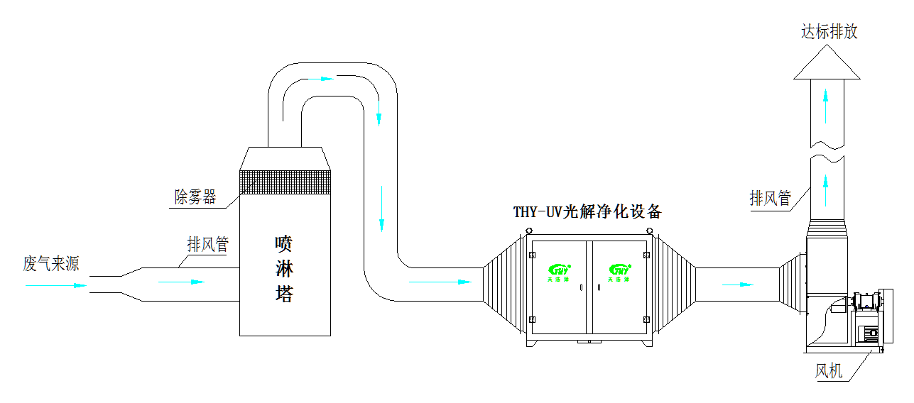 印刷廢氣處理需要考慮運營成本及安(ān)全性,本方案工藝路線(xiàn)擬采用以“通風係統(風機、收集罩、管道)+預處理係統(噴(pēn)淋塔)+深(shēn)度淨(jìng)化係統(UV光解淨化設備)”為(wéi)核心工藝來處理印(yìn)刷廢氣,工藝設備圖如下: